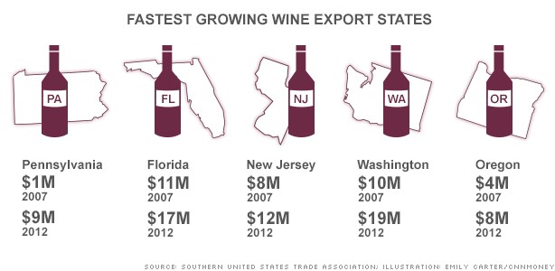 While most exports still come from California, other states are getting in on the game. New York has long been known for its growing wine industry, but Florida and New Jersey are nursing start-up vineyards as well.